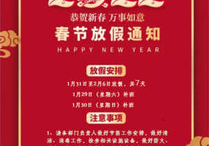 依据国家关于元旦放假的相关规定,1月1日为元旦节,公司定于1月1日放假1天,1月2日星期四正常上班,请各部门安排好各自工作,值日生注意检查关闭电源并锁好门窗。放假期间注意交通安全!祝福大家新年快乐!